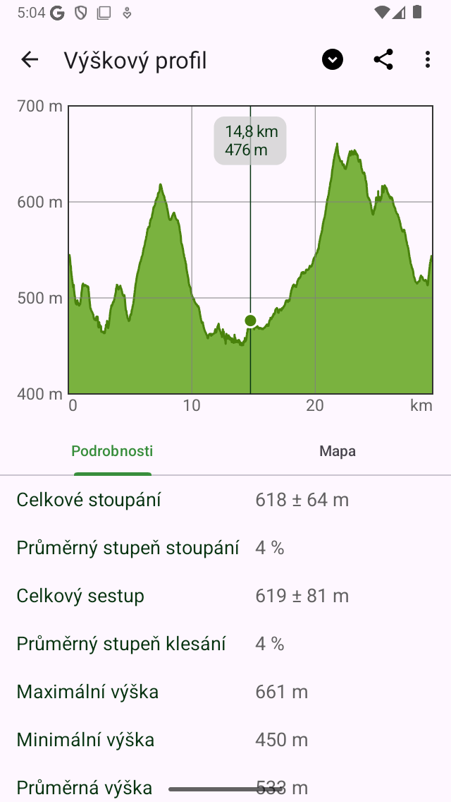 Obrazovka výškového profilu obsahuje graf a informace. Graf obsahuje ukazatel, který můžete přetáhnout a odečíst hodnotu z profilu. Uložením dvou prstů na profil a jejich přemístěním od sebe můžete přiblížit profil a zobrazit tak další podrobnosti. Pokud se přiblížíte, můžete profil přesunout také jedním prstem. Chcete-li oddálit, položte dva prsty na profil a přesuňte je směrem k sobě.