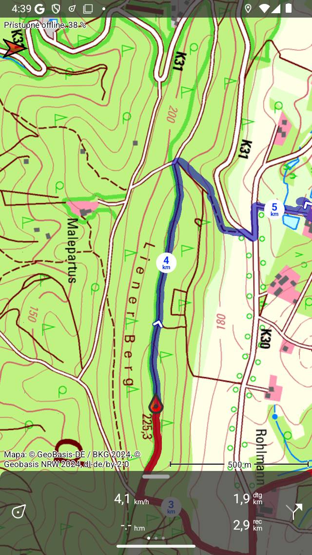 Na palubní desce je zobrazen symbol „dtg“, což je vzdálenost na konec modré trasy, která je ve výše uvedeném příkladu 1,9 km. Symbol „rec“ na palubní desce označuje délku zaznamenané trasy, která je ve výše uvedeném příkladu 2,9 km. Pokud klepnete na symbol „rec“, mapa se přiblíží k zaznamenané trase. Pokud klepnete na symbol „dtg“, mapa se přiblíží na modrou trasu.