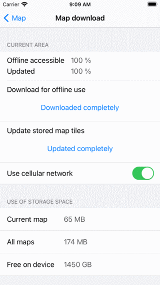 Mens du downloader kortfliser, øges procentdelen tilgængelige offline til 100%. Du kan til enhver tid annullere overførslen af kortfliser ved at trykke på ›Stop download‹.