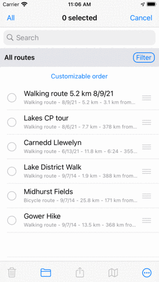 For hurtigt at vælge flere ruter kan du trykke længe på et element, lade fingeren være på listen og derefter gå op eller ned. På samme måde kan du hurtigt fravælge flere elementer.