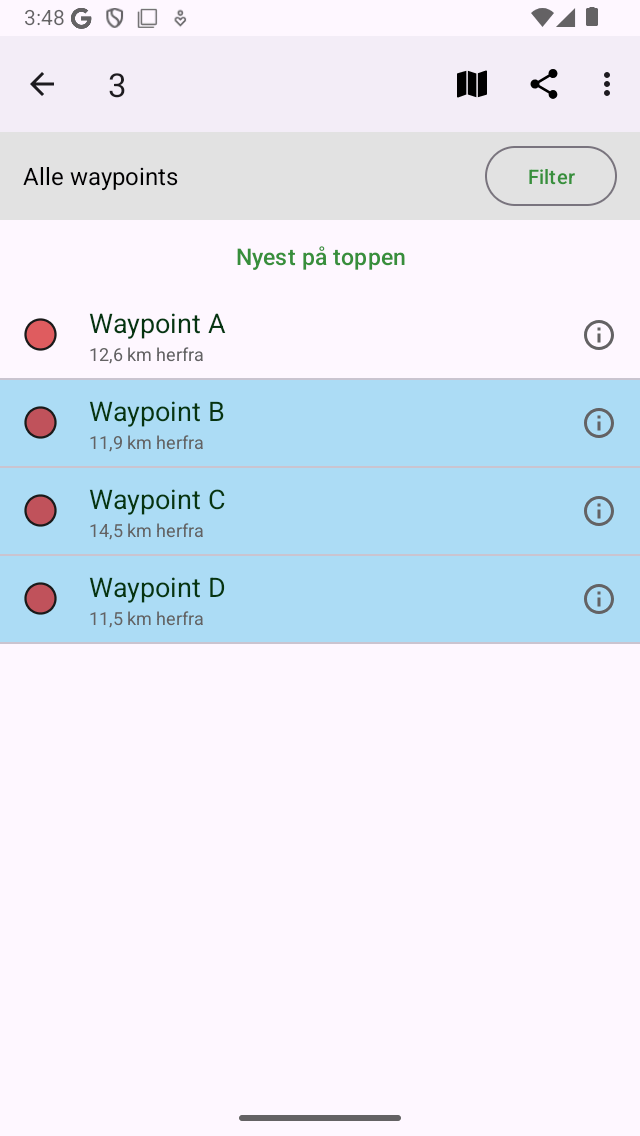 Hvis du vil vælge flere waypoints, skal du trykke på et waypoint-element på valgskærmen. Baggrunden for waypoint-elementet bliver lyseblå for at indikere, at det er valgt. Et eksempel, hvor tre waypoints er valgt, vises nedenfor: