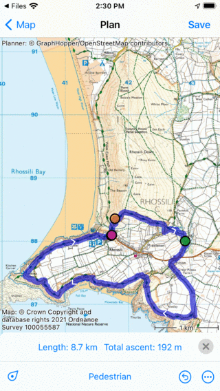 Πατώντας παρατεταμένα το πράσινο σημείο διαδρομής μπορείτε να το σύρετε στο κάτω ή στο επάνω μέρος της οθόνης για να το αφαιρέσετε. Η διαδρομή μεταξύ του προηγούμενου και του επόμενου σημείου θα υπολογιστεί εκ νέου έτσι ώστε να διασχίζει τον «δρόμο Gower» όπως φαίνεται παρακάτω: