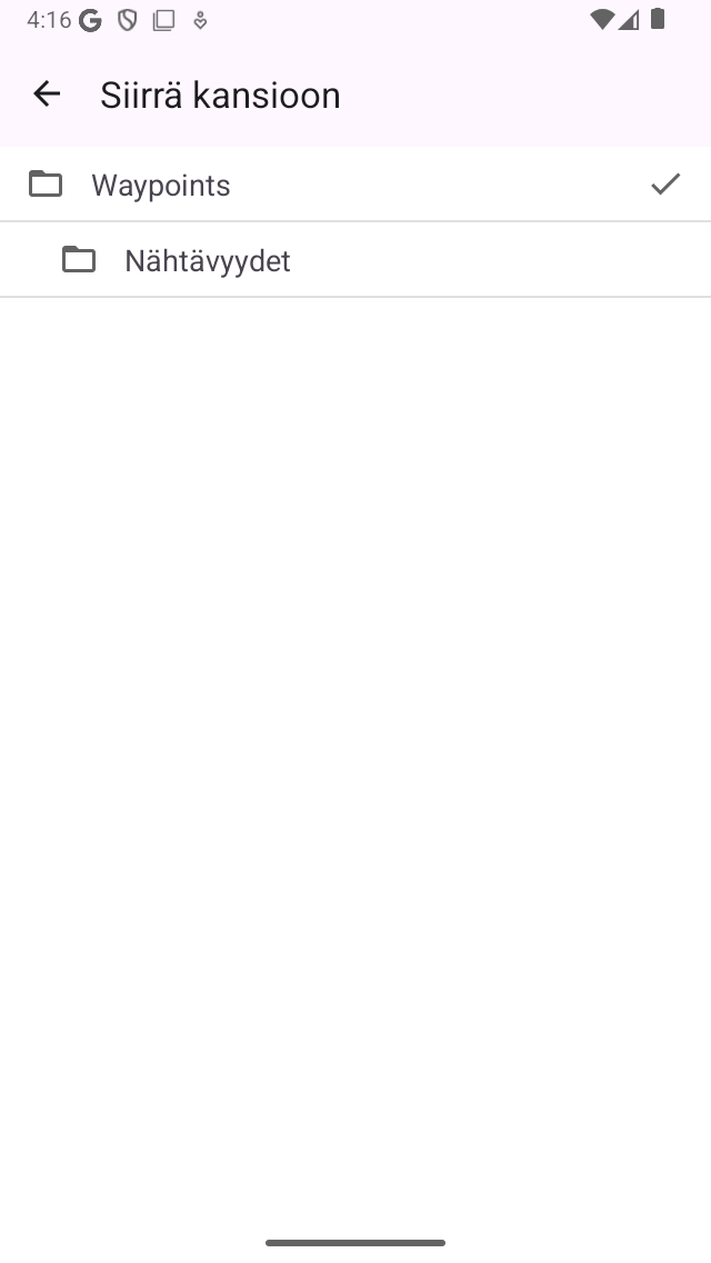 ”Siirrä kohteet kansioon” -näytössä näkyy kansiopuu. Jos napautat kansiota, valitut kohteet siirretään kyseiseen kansioon ja palaat reittipisteiden näyttöön.