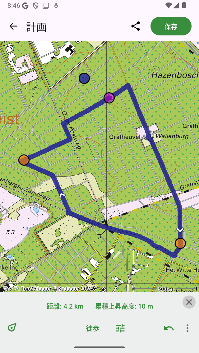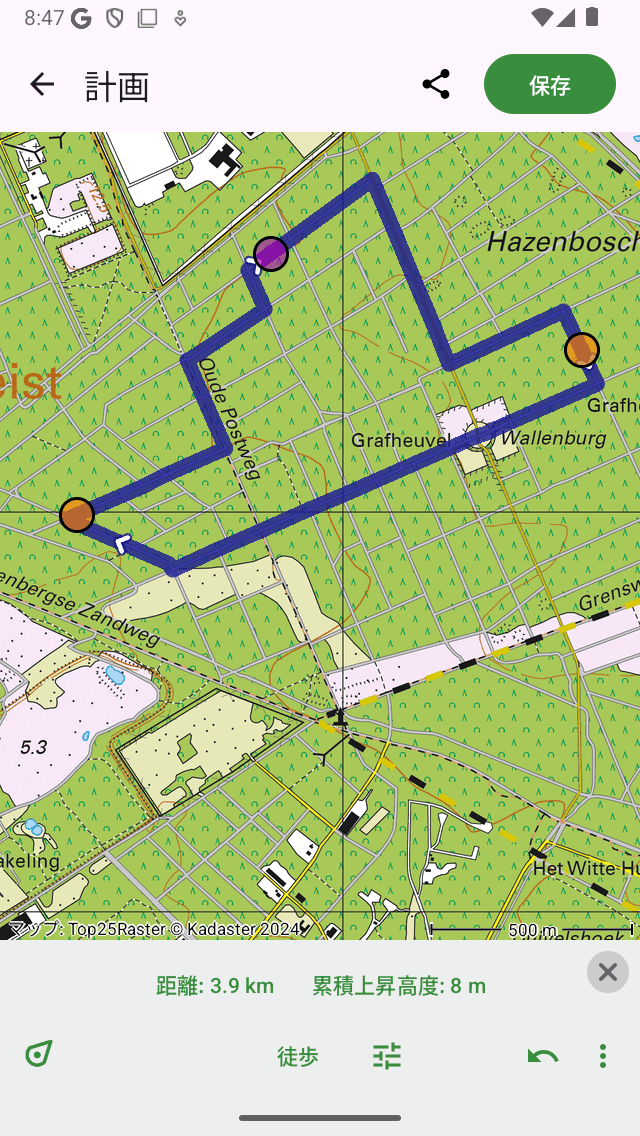 計画ルートの長さは、下部のルートプランナーオーバーレイに表示されます。長さをタップすると、地図は計画ルートにズームします。また、オーバーレイには総上昇量が表示されます。合計上昇回数をタップすると、計画中のルートの高さプロファイルが表示されます。