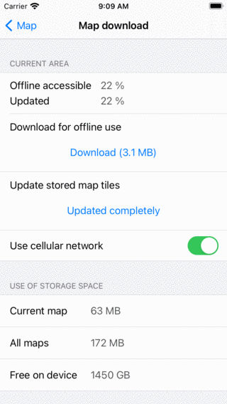 マップタイルをデバイスに保存するには、ディスク容量が必要です。マップのダウンロード画面では、使用されているスペースを確認できます。