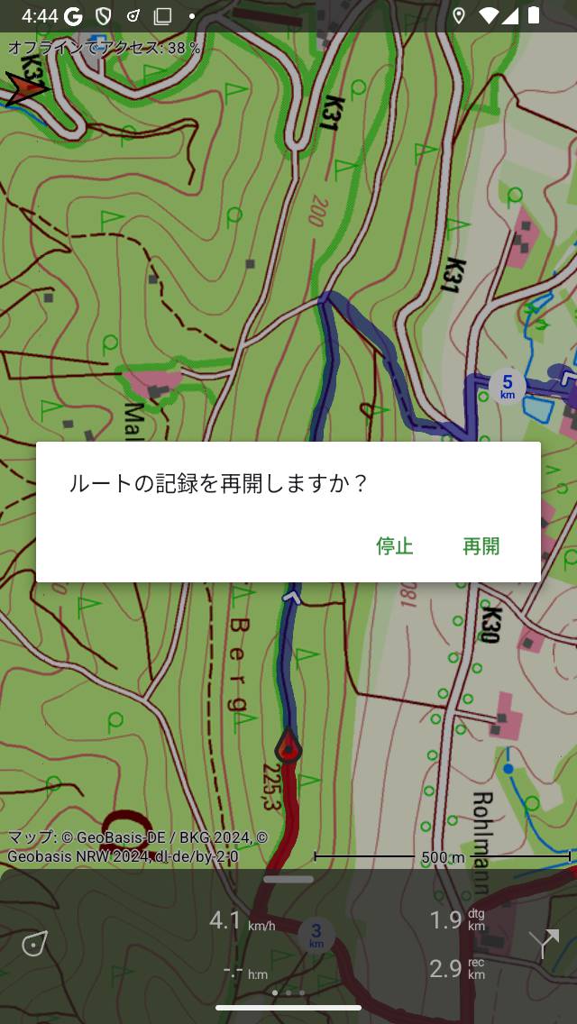 [再開] を押すと、録音が続行されます。「停止」を押すと、ルートの記録が終了し、記録したルートを保存できるようになります。