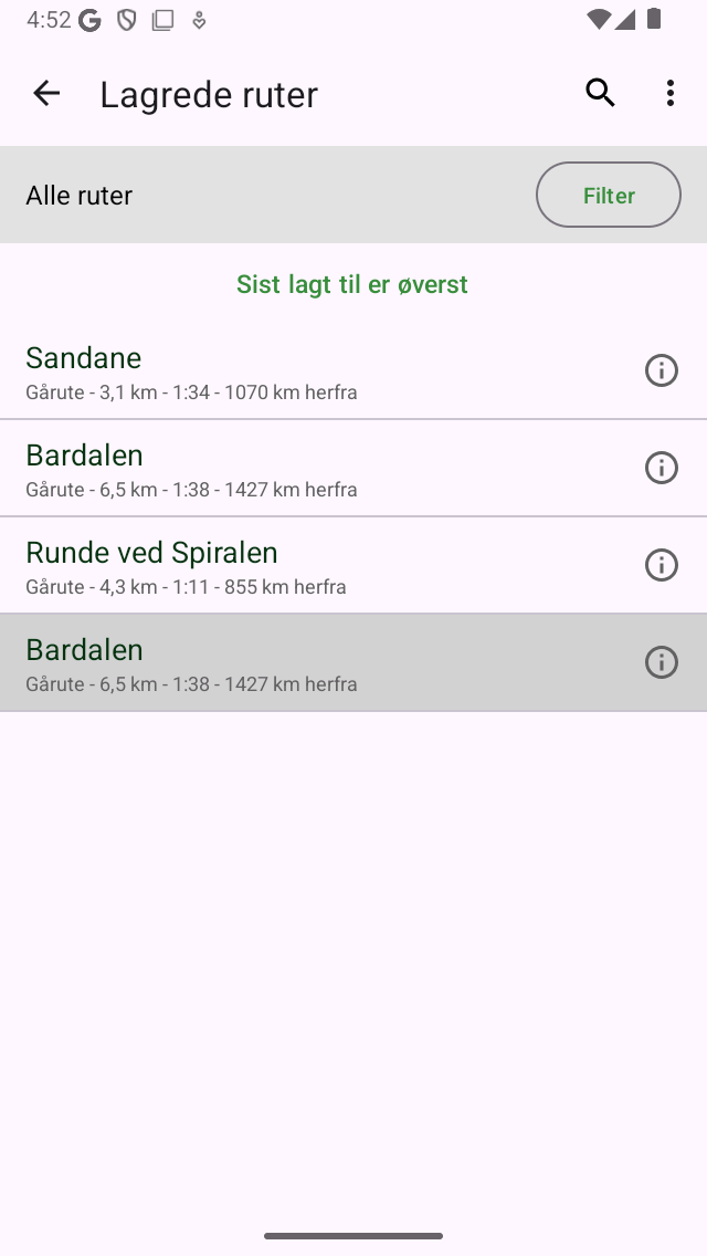 Det er også mulig å fjerne alle lastede ruter fra kartet samtidig ved å trykke på: Mer (øverst til høyre i skjermbildet for lagrede ruter) > Fjern alt fra kartet.