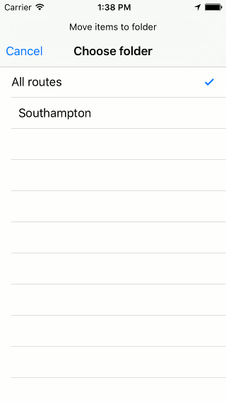 Hvis du vil flytte ruter til en mappe, må du åpne markeringsskjermbildet ved å trykke Mer > Velg eller trykke lenge på et element i ruteskjermen. Velg rutene som skal flyttes, og trykk på mappeikonet nederst på verktøylinjen. Deretter vises skjermbildet «Flytt elementer til mappe», eksempelet vises nedenfor: