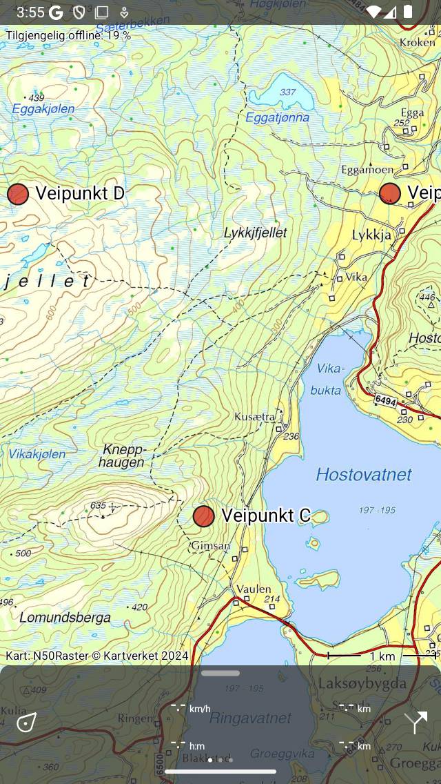 Veipunktene ’B’, ’C’ og ’D’ er lastet inn på kartet.¶
