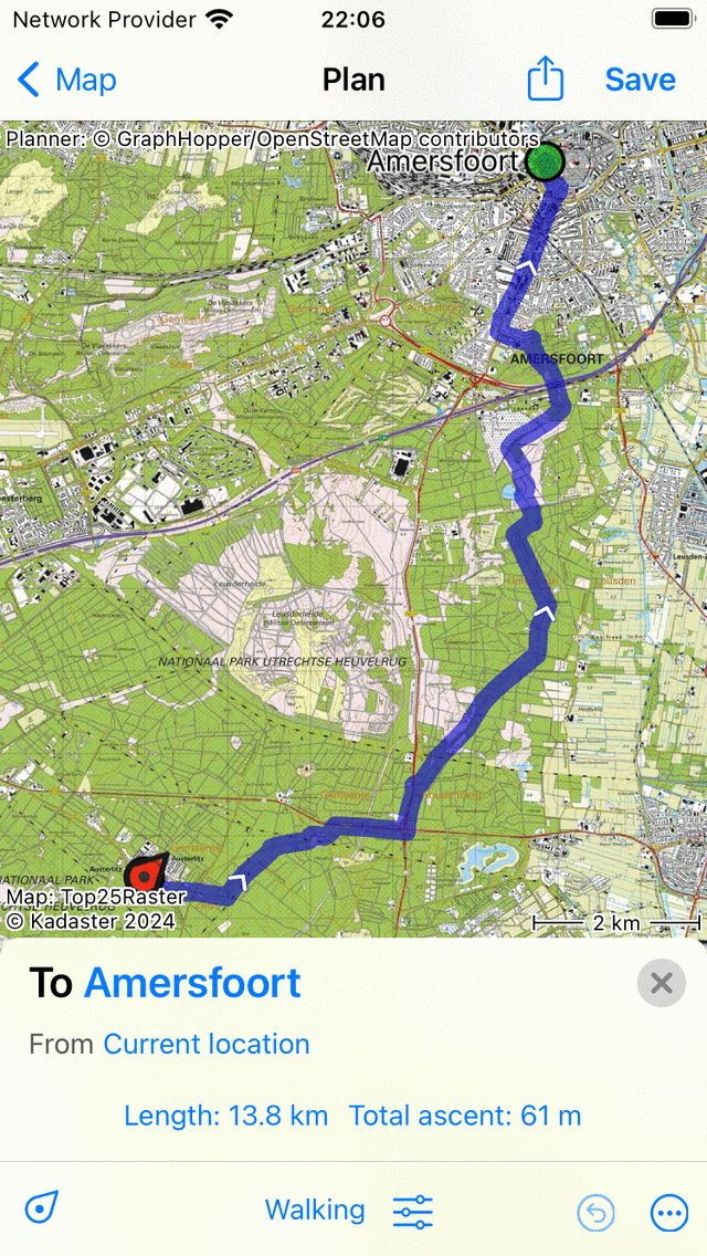 Ako príklad sme uviedli „Amersfoort“ v poli „To“. Ak teraz klepnete na „Plán“ vpravo hore alebo klepnete na polohu v zozname výsledkov vyhľadávania, vrátite sa na obrazovku plánu a bude naplánovaná trasa z vašej aktuálnej polohy do „Amersfoort“, ako vidíte v príklade nižšie: