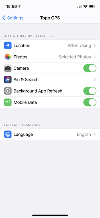 Ak sa posúvate do dolnej časti obrazovky nastavení alebo prejdete do aplikácie Nastavenia systému iOS > Topo GPS, môžete upraviť nastavenia zariadenia aplikácie Topo GPS.