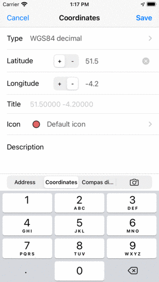 Če ste prejeli seznam koordinat v besedilni obliki, jih lahko vnesete ena za drugo prek vhodnega zaslona koordinat, kot je razloženo zgoraj.