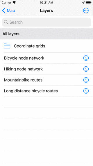 Plasti s sivim ozadjem so trenutno naložene na zemljevid. Če tapnete element brez sivega ozadja, bo naložen na zemljevid in se boste vrnili na glavni zaslon. Če tapnete plast s sivim ozadjem, bo odstranjena z zemljevida. Če želite odstraniti vse plasti, na zaslonu plasti tapnite« Več > Odstrani vse s zemljevidom«.