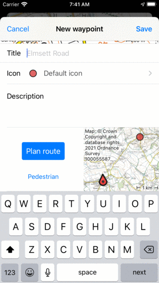 Якщо ви хочете спланувати маршрут від вашого поточного місця розташування до точки на карті, найшвидший спосіб - довго натискати на карту. з’явиться значок, який можна перетягнути в потрібне місце. Якщо ви відпустите палець, з’явиться екран створення шлякової точки. Прокрутіть униз на цьому екрані, щоб побачити розділ плану маршруту, як у прикладі нижче.