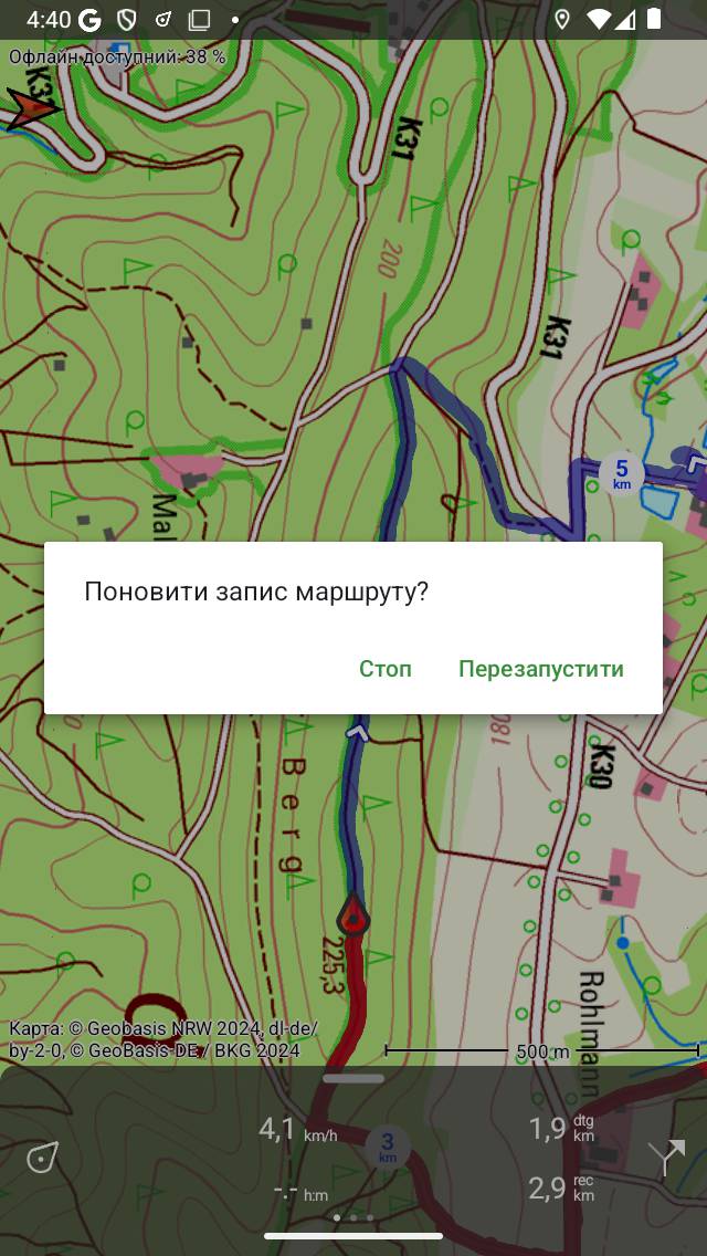 Якщо ви натиснете «Відновити» запис буде продовжено. Якщо ви натиснете «Зупинити» запис маршруту буде завершено, і вам буде надана можливість зберегти записаний маршрут.