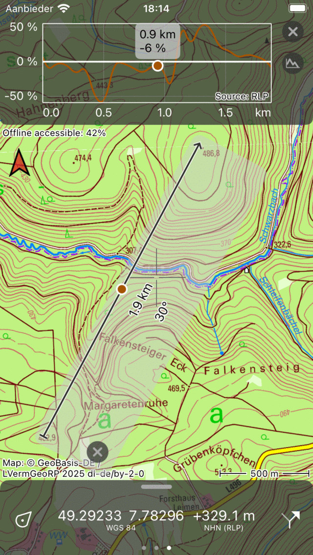 Chcete-li rychle získat výškový profil podél přímky, musíte aktivovat pravítko mapy. Dlouhým stisknutím na mapě se zobrazí ikona vytvoření trasového bodu, poté přidáním druhého prstu aktivujte pravítko. Pokud je pravítko mapy v pokryté oblasti a pravítko je dostatečně dlouhé, vedle ikony zavíracího kříže se zobrazí ikona výškového profilu. Pokud klepnete na ikonu výškového profilu, profil se zobrazí v horní části obrazovky. Toto je výškový profil podél linie pravítka mapy.