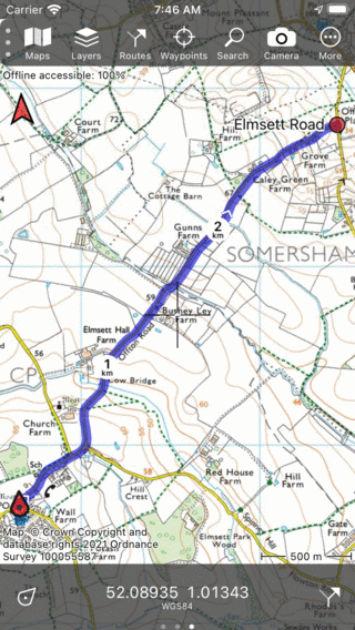 Pokud chcete naplánovat trasu z aktuální polohy do bodu na mapě, nejrychlejším způsobem je stisknutí dlouhého stisknutí mapy. Zobrazí se ikona, kterou můžete přetáhnout na požadované místo. Pokud uvolníte prst, zobrazí se obrazovka vytvoření traťového bodu. Posuňte se dolů na této obrazovce a zobrazte část plánu trasy, jak je uvedeno v následujícím příkladu.