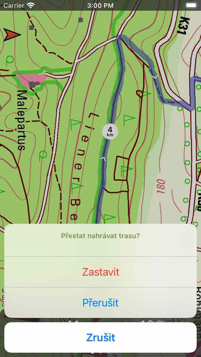 Pokud stisknete tlačítko „Pokračovat“ bude nahrávání pokračovat. Pokud stisknete ‚Stop‘, záznam trasy bude dokončen a budete mít možnost uložit zaznamenanou trasu.