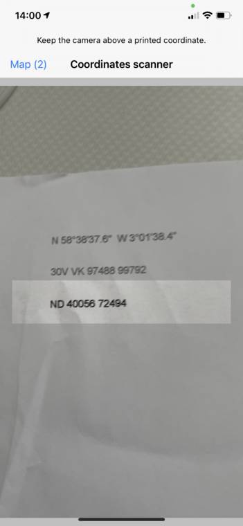 Hvis du åbner koordinatscanneren, kan du se billedet af kameraet. I midten er der et lettere rektangel. Placer rektanglet over koordinaterne. Du kan zoome ind og ud med to fingre for at fokusere rektanglet på koordinaterne. Koordinaterne skal udskrives på en linje. Det er ikke muligt at scanne flere koordinater på én gang.