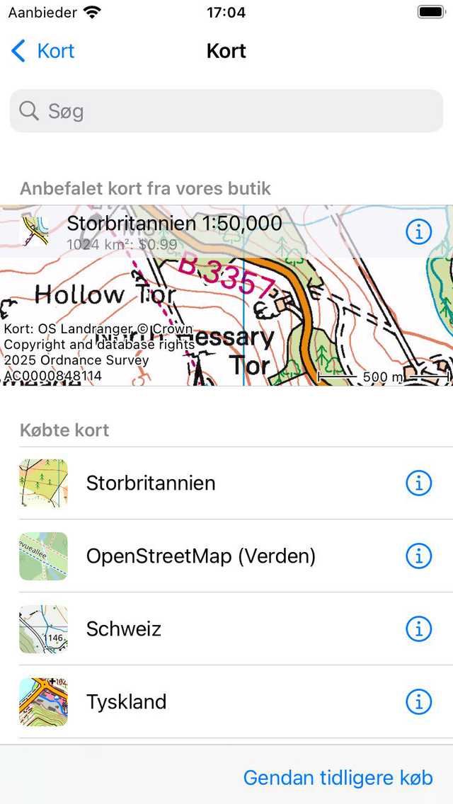 I eksemplet ovenfor har brugeren rullet til den nordlige grænse af det topografiske kort over Schweiz. Øverst på skærmen er baggrunden grå, fordi den del ikke er dækket af kortet. Pop-up foreslår et alternativt kort, i dette tilfælde det topografiske kort over Tyskland eller OpenStreetMap. Hvis du trykker på et af disse kort, og du har købt det, vil det aflyttede kort være åbent og zoomet til det aktuelle synlige område. Hvis du ikke har købt det aflyttede kort, vises købsvinduet. I eksemplet nedenfor er kortet blevet ændret til det topografiske kort over Tyskland.