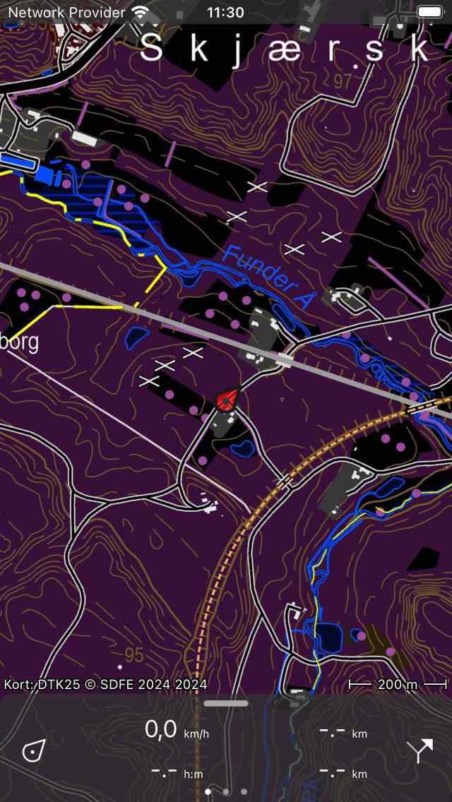 Du kan indstille kortstilen i Topo GPS til ›Normal‹ eller ›Mørk‹ i indstillingerne. Den normale stil har lyse farver. Et eksempel på den mørke kortstil er vist nedenfor: