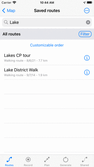 Det er også muligt at filtrere ruter efter placering, længde og type. For at aktivere et filter skal du trykke på filterknappen i ruterskærmen (lige under søgefeltet til højre). Hvis filteret er aktiveret, har filterknappen en blå baggrund, som i figuren nedenfor. Hvis filteret er deaktiveret, er kun kanten af filterknappen blå, som i figuren ovenfor.