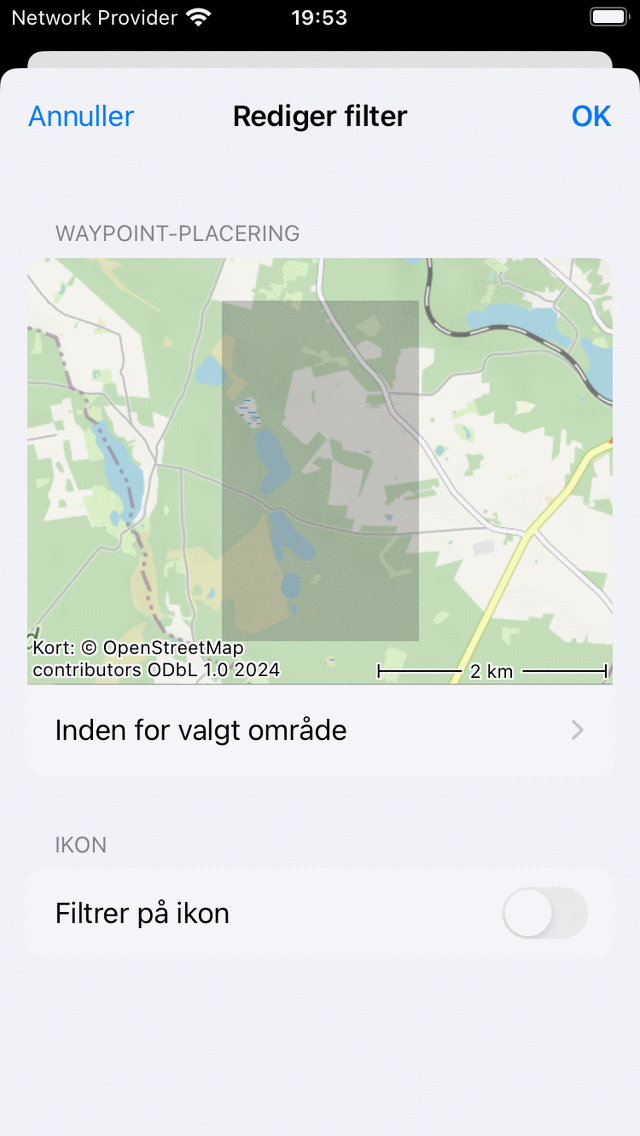 Det grå overlejringsområde angiver det område, de filtrerede waypoints skal være placeret i. Du kan ændre størrelsen på overlayet ved at holde en finger og flytte op-ned eller venstre-højre, og du kan zoome, rotere og flytte kortet for at ændre det valgte område.