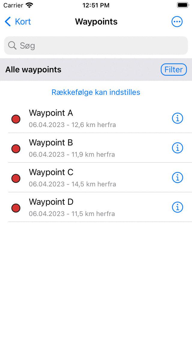Hvis du vil indlæse waypoints, der er gemt på din enhed, på kortet, skal du først åbne waypoints skærmen. Du kan åbne waypoints skærmen ved at trykke på ›Waypoints‹ i menuen. Et eksempel på waypoints skærmen vises nedenfor: