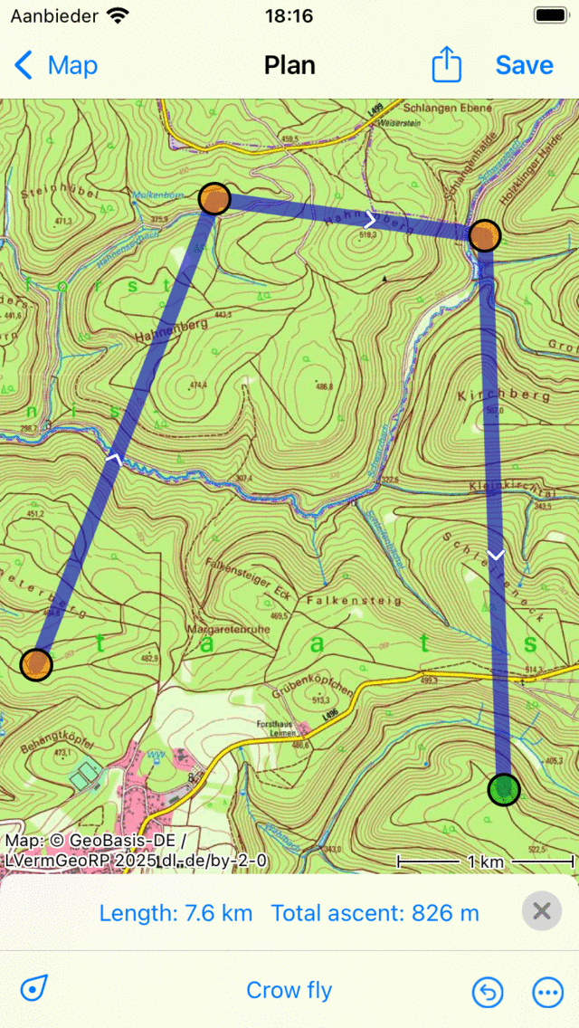 Im Beispiel wird eine Luftlinie geplant. Im unteren Bereich wird der Gesamtaufstieg entlang der Route angezeigt. Wenn Sie auf den Gesamtanstieg tippen, wird das Höhenprofil angezeigt.