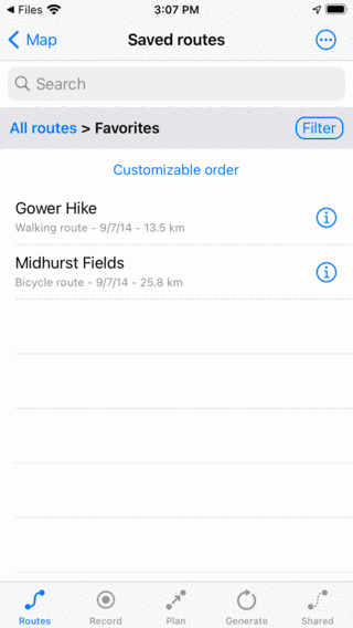 Στην οθόνη των διαδρομών οι διαδρομές «Gower Hike» και «Midhurst Fields» έχουν εξαφανιστεί. Τώρα μπορούν να βρεθούν στο φάκελο «Αγαπημένα».