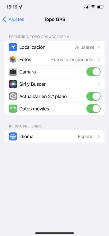 Si te desplazas hasta la parte inferior de la pantalla de ajustes o vas a la aplicación Configuración de iOS > Topo GPS, puedes modificar la configuración del dispositivo de Topo GPS.