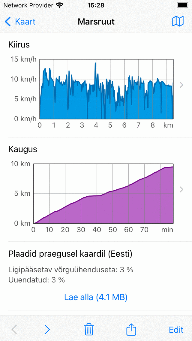 Näide kiiruse ja kauguse profiilidest marsruudi üksikasjade ekraanil.¶