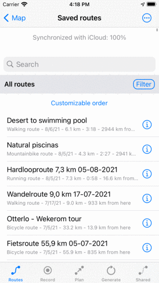 Marsruute ja teekonnapunkte saab automaatselt sünkroonida iCloudiga Topo GPS-is. See muudab kõik teie marsruudid ja teepunktid kättesaadavaks kõigis teie seadmetes. Sellel on kaks eelist: