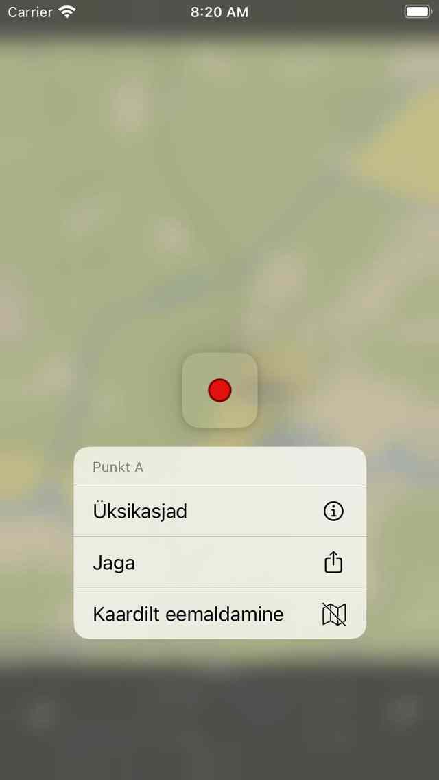 Kiirtoimingute menüü abil saate vaadata teepunkti üksikasju, jagada teepunkti ja eemaldada teepunkt kaardilt.