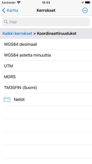 Jos napautat koordinaatistoa, se ladataan kartta ja palaat päänäyttöön. Jos palaat koordinaatisaruudukoiden näyttöön, ladatun ruudukon tausta on harmaa. Jos napautat sitä, se poistetaan kartalta.