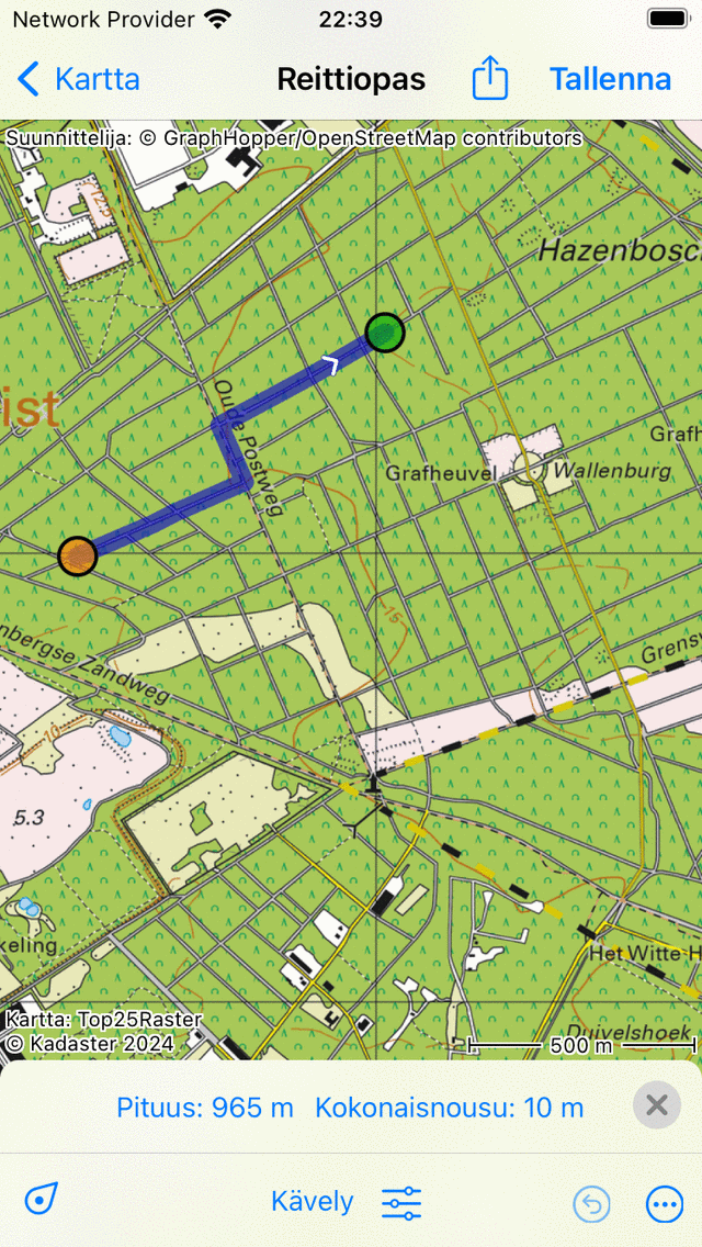 Voit lisätä toisen reittipisteen painamalla pitkään karttaa. Tämä on värillinen sininen ja osoittaa reittipisteen, joka lisätään. Sininen reittipiste seuraa aina vihreää. Sininen reittipiste on nyt vedettävä haluttuun asentoon. Jos vapautat sormesi, reitti suunnitellaan vihreästä siniseen reittipisteeseen, kuten alla näet: