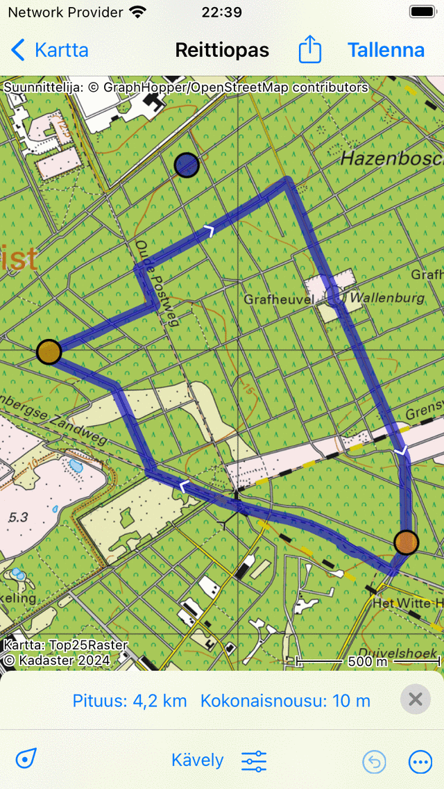 Suunnitellun reitin pituus ilmoitetaan alareunassa olevassa reittisuunnittelijan peitossa. Jos napautat pituutta, kartta lähentää suunniteltua reittiä. Myös kokonaisnousu näkyy peittokuvassa. Jos napautat kokonaisnousua, voit tarkastella suunnitellun reitin korkeusprofiilia.