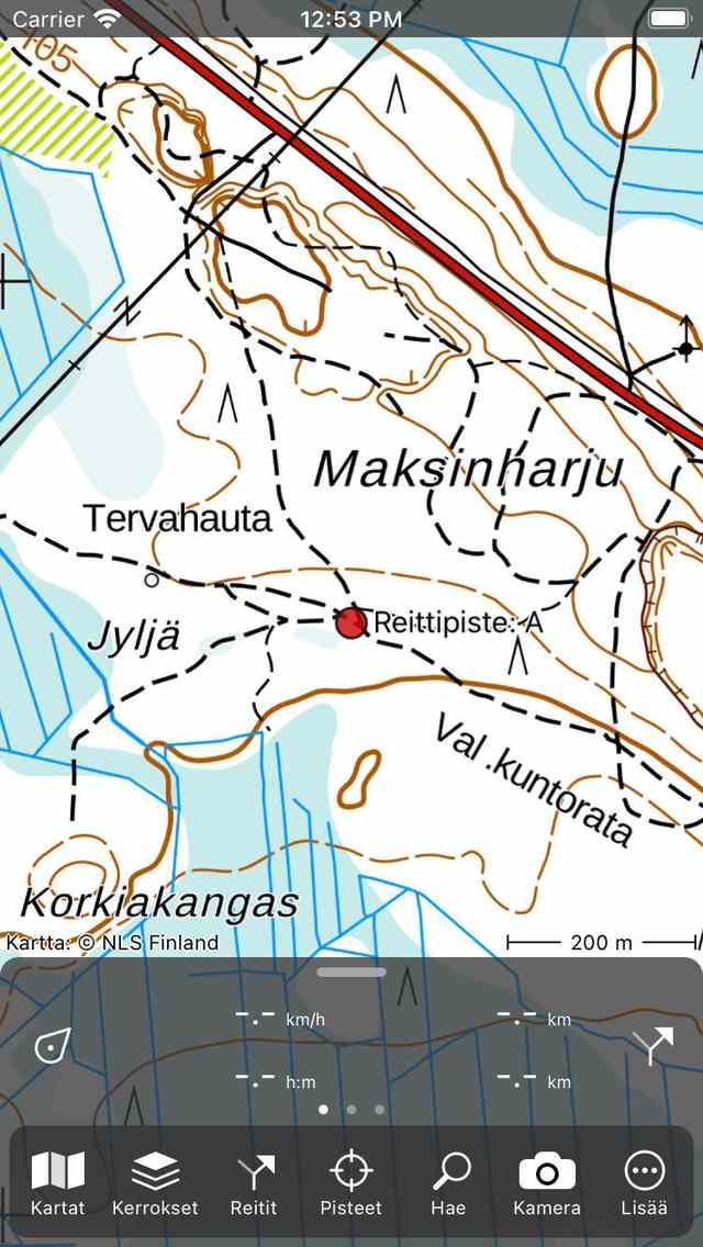 Jos lähellä toisiaan on kaksi reittipistettä, kuvakkeet voivat olla päällekkäisiä, kun niitä loitontaa tarpeeksi pitkälle. Sen sijaan Topo GPS näyttää vain viimeisimmän lisätyn reittipisteen ja toista reittipistettä ei näytetä. Taustalla oleva toinen reittipiste näkyy vain, jos zoomaat tarpeeksi pitkälle. Jos reittipisteet eivät näy, kun niitä suurennetaan maksimaalisesti, voit yrittää laajentaa kartan suurinta sallittua zoomausta Topo GPS -asetuksissa.