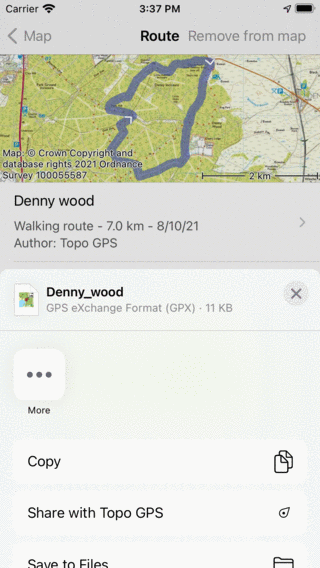 Per condividere un percorso con Topo GPS, toccare l’icona di esportazione nella parte inferiore della schermata dettagli del percorso.