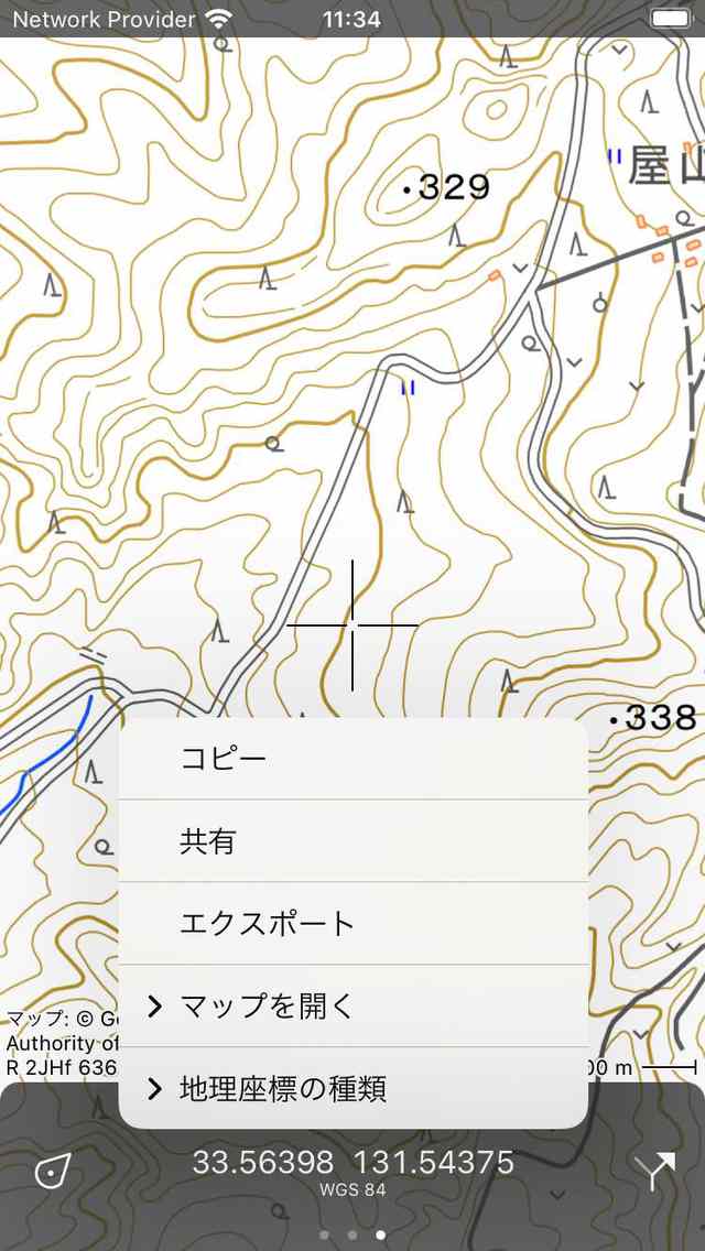 で開く:他の人気のアプリで座標を開くことができます。現在、Apple マップ、Google マップ、ウィキペディアのいずれかを選択できます。地図アプリを選択すると、地図アプリはTopo GPSで現在表示している場所とまったく同じ場所で開きます。「ウィキペディア」を選択すると、ウィキペディアのアプリまたはウェブサイトが開き、十字架の真ん中に最も近い場所の情報が表示されます。これは、特定のサイトに関する情報を地図上で調べたい場合に便利です。