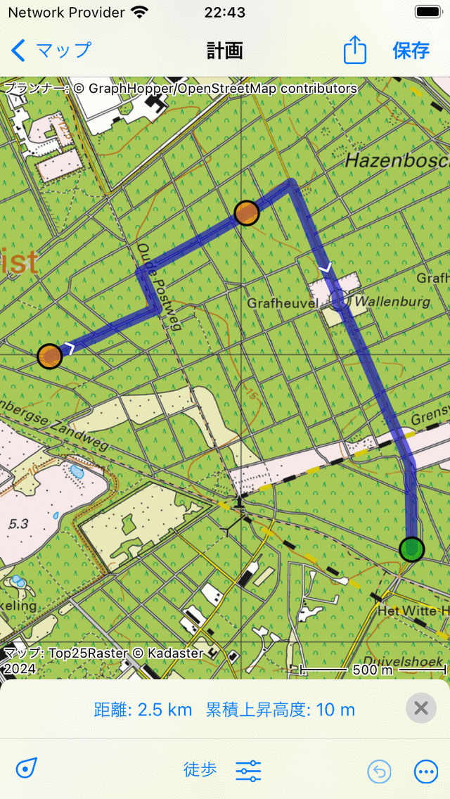 ルートポイントを移動した後に新たに計画されたルート。¶