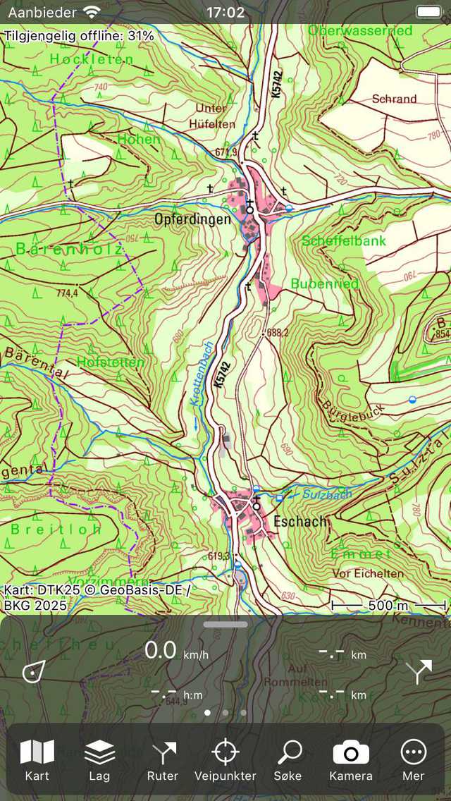 I eksemplet over har brukeren rullet til den nordlige grensen til det topografiske kartet over Sveits. Øverst på skjermen er bakgrunnen grå, fordi den delen ikke dekkes av kartet. Popup-vinduet foreslår et alternativt kart, i dette tilfellet det topografiske kartet over Tyskland eller OpenStreetMap. Hvis du trykker på et av disse kartene og du har kjøpt det, åpnes kartet som er tappet, og zoomet til det synlige området. Hvis du ikke har kjøpt det tappede kartet, vises kjøpsvinduet. I eksemplet nedenfor er kartet endret til det topografiske kartet over Tyskland.
