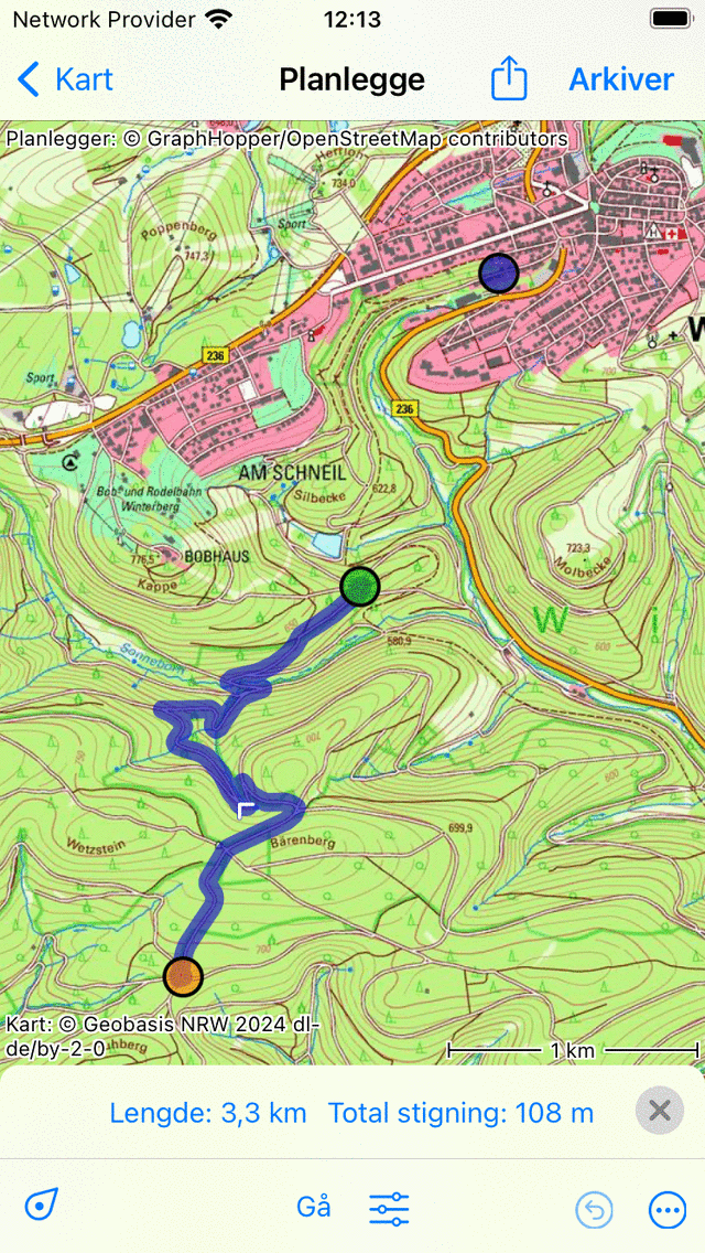 Legg deretter til et nytt rutepunkt ved å trykke lenge på kartet. En rute vil bli trukket fra det tilføyde punktet til det opprinnelige utgangspunktet.