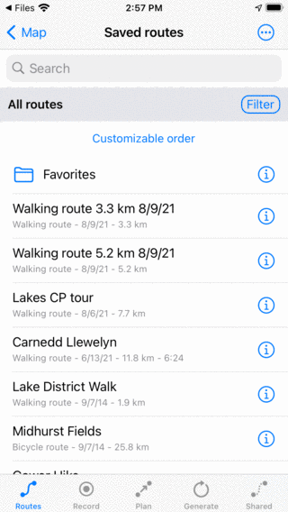 Alternativt kan du trykke på info-knappen ved siden av en mappe på ruteskjermen. Trykk deretter på «Vis på kart» øverst til høyre for å laste alle ruter på kartet. Du vil gå tilbake til hovedkartskjermen og kartet vil bli zoomet til innholdet i mappen.