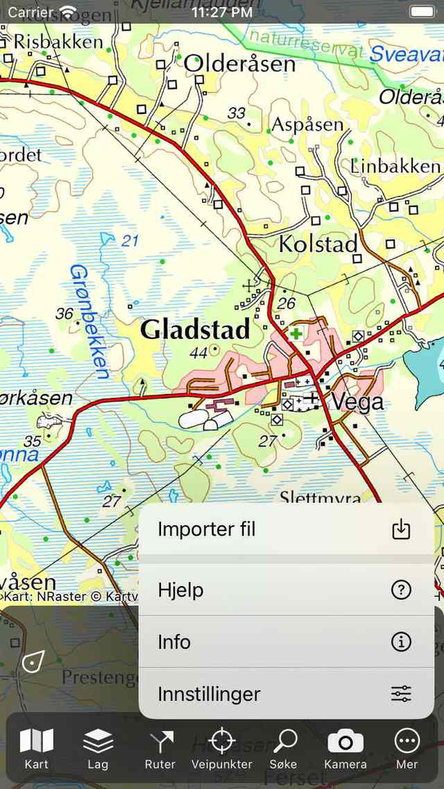 Alternativt kan du importere filene direkte til Topo GPS ved å trykke på Meny > Mer > Importer fil i hovedskjermbildet som vist nedenfor. Deretter åpnes filer-appen. Her kan du velge en skylagring, som iCloud, Dropbox, OneDrive eller Google Drive. Deretter kan du bla gjennom filene dine og velge filene du vil importere.