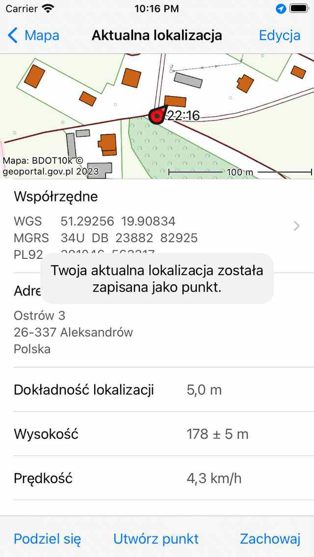 Jeśli naciśniesz „Zapisz”, aktualna pozycja zostanie natychmiast zapisana jako punkt trasy i dodana do mapy. Wyskakujące okienko pokaże, że punkt trasy został pomyślnie zapisany, jak widać na poniższym rysunku: