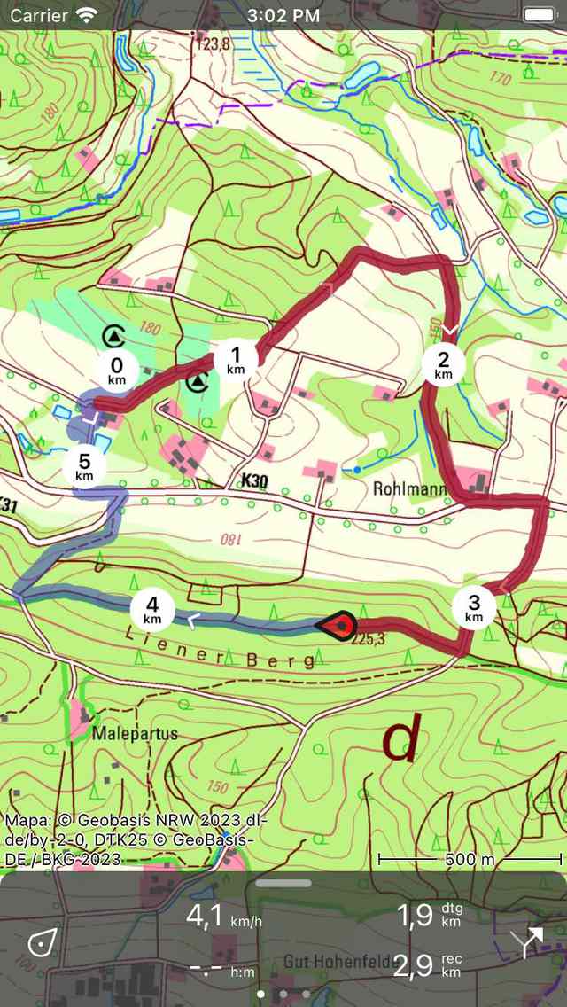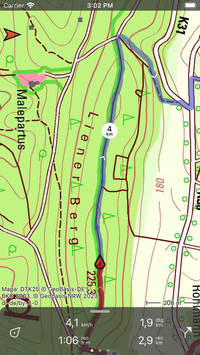 Na prístrojovej doske je zobrazený symbol „dtg“, to je vzdialenosť, ktorá sa má prejsť na koniec modrej trasy, ktorá je vo vyššie uvedenom príklade 1,9 km. Symbol „rec“ na prístrojovej doske označuje dĺžku zaznamenanej trasy, ktorá je vo vyššie uvedenom príklade 2,9 km. Ak klepnete na symbol „rec“, mapa sa priblíži na zaznamenanú trasu. Ak klepnete na symbol „dtg“, mapa sa priblíži na modrú trasu.