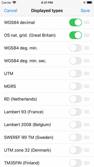 Ak ťuknete na zobrazené typy súradníc, zobrazí sa obrazovka, v ktorej môžete zapnúť a zakázať typy súradníc. Príklad tejto obrazovky je uvedený nižšie: