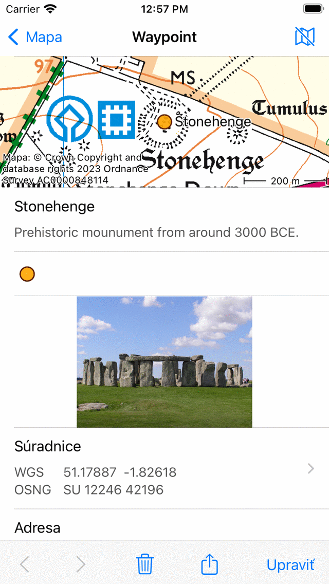 Pridané fotografie si môžete prezrieť na obrazovke podrobností o trasovom bode. Nižšie vidíte príklad obrazovky podrobností o trasových bodoch „Stonehenge“ s fotografiou: