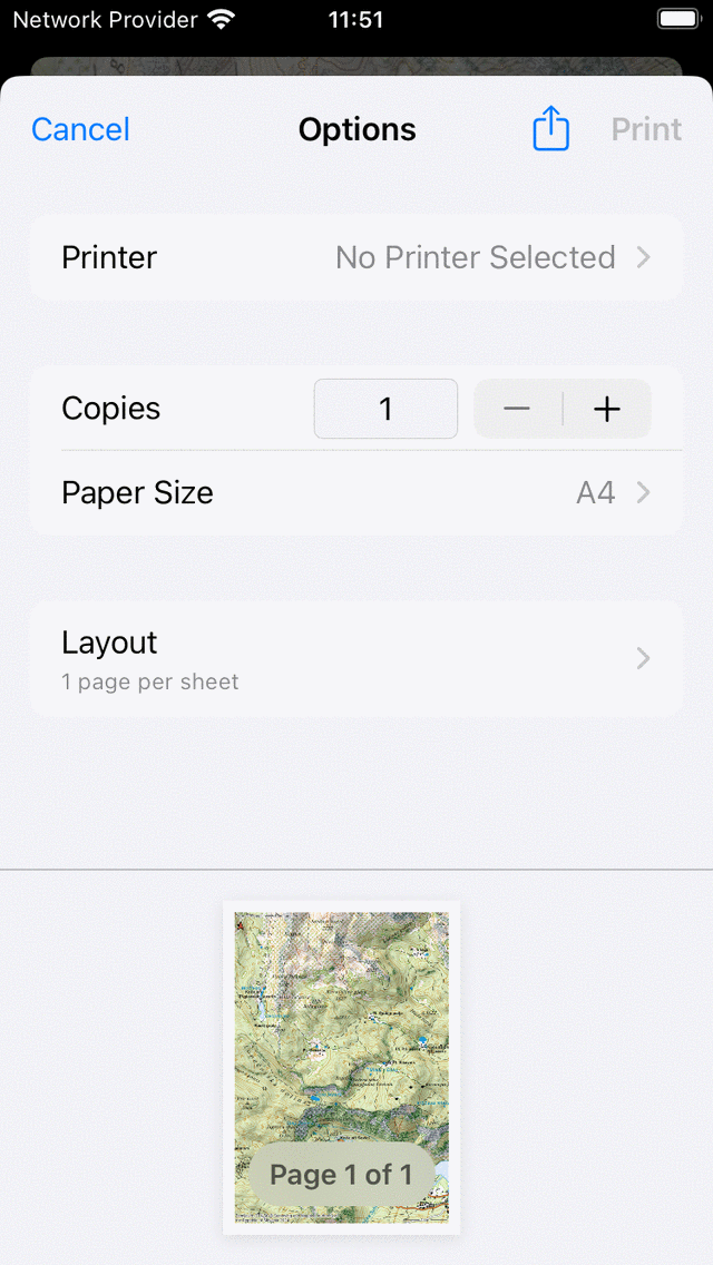 Če želite natisniti zemljevid, najprej izberite del zemljevida, ki ga je treba natisniti. To lahko storite tako, da hkrati pritisnete dolgo z dvema prstoma na zemljevidu. Premikanje prstov lahko spremeni izbiro. Če spustite prste, v pojavnem oknu tapnite« Natisni«. Včasih bi bilo koristno, da zemljevid najprej zasukate, preden naredite izbiro.